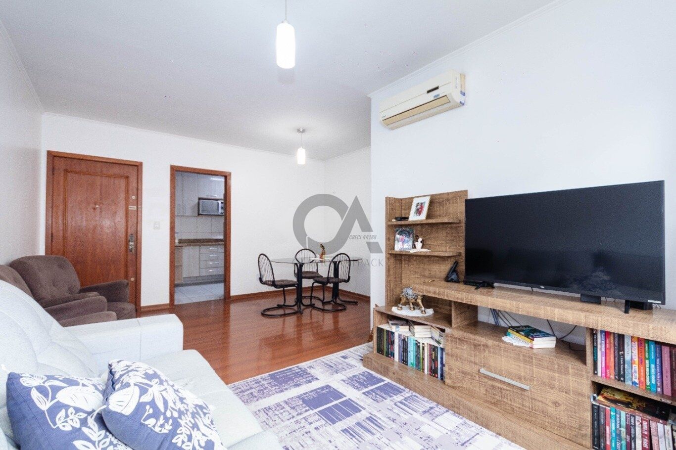 • Áreas: Living amplo com piso laminado, cozinha funcional integrada à área de serviço